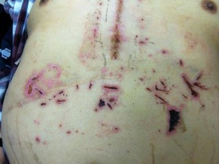 Rapid City, South Dakota – A member and resident of the Cheyenne River Sioux Tribe of South Dakota came home from a 14-day stay in the hospital to find he had been horribly mutilated.  Three Ks can be easily seen carved or burned into his abdomen in the shocking photograph taken the day after he came home.